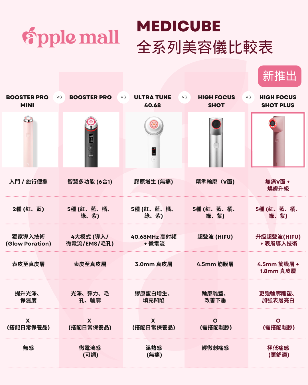 Apple Mall 幫大家整理了 Medicube 全系列美容儀比較表,還有最新推出的 High Focus Shot Plus 重點介紹,看完保證你不再有選擇困難症!