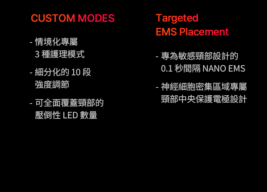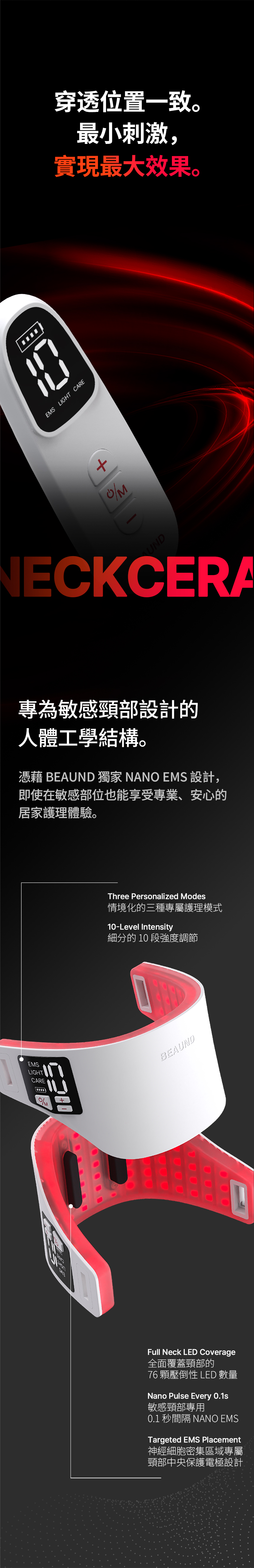 溫和Nano EMS+NIR光療,提拉緊緻頸部輪廓。