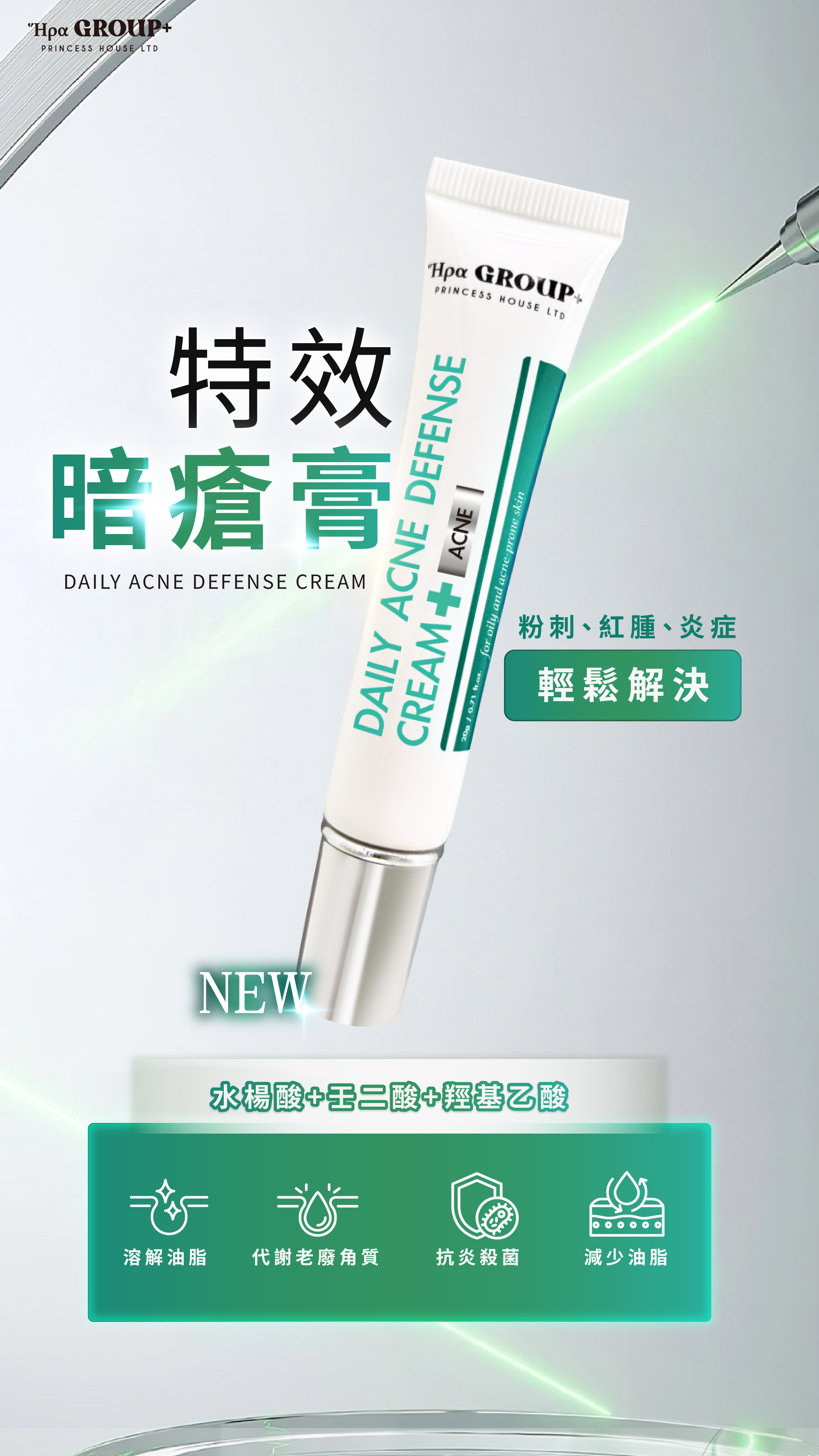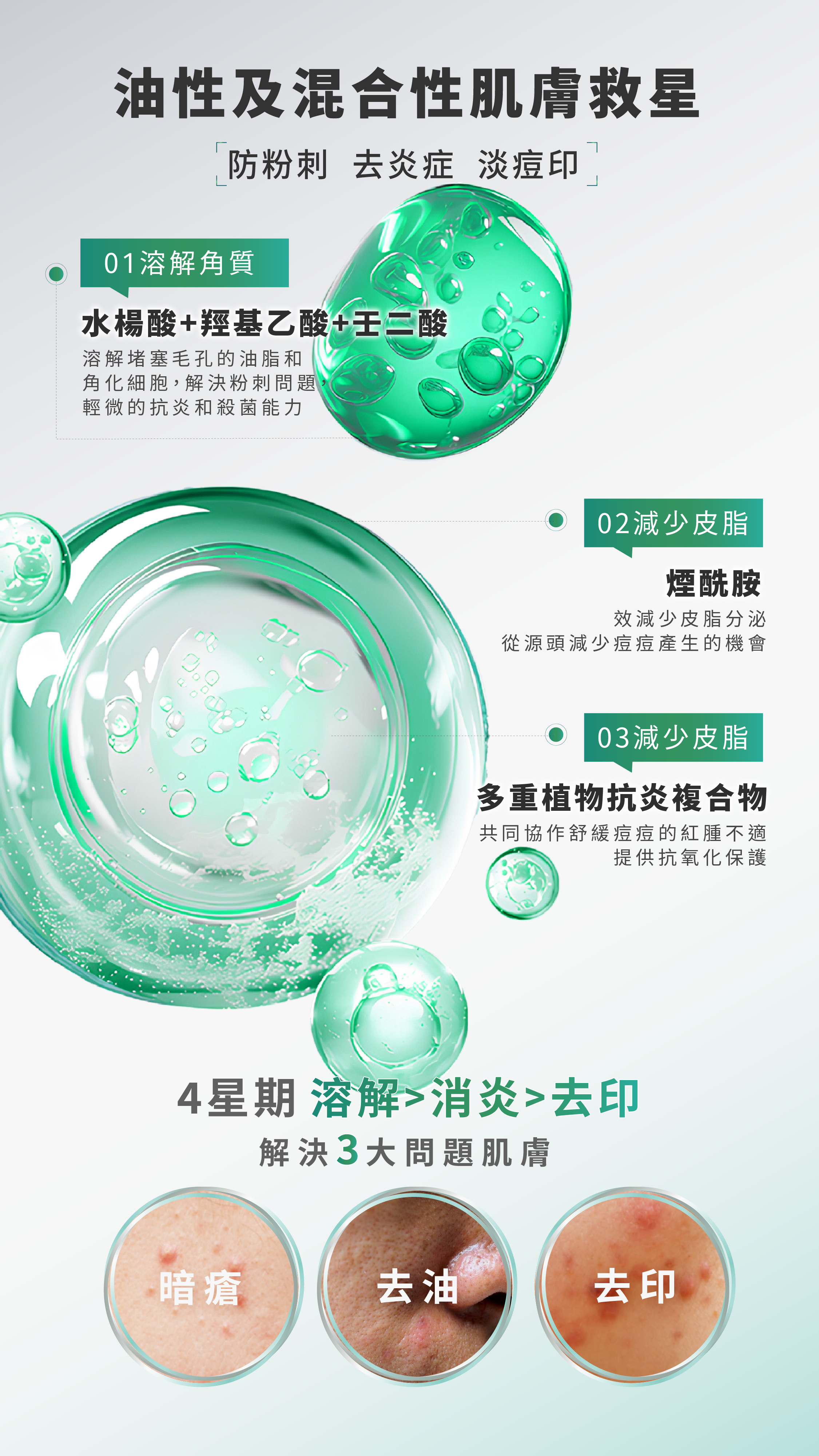 羥基乙酸:有效鬆動並去除老廢角質,促進皮膚更新。與水楊酸(深入毛孔)協同作用,達到「表層代謝」與「深層疏通」的雙重效果,讓肌膚更光滑、細緻。