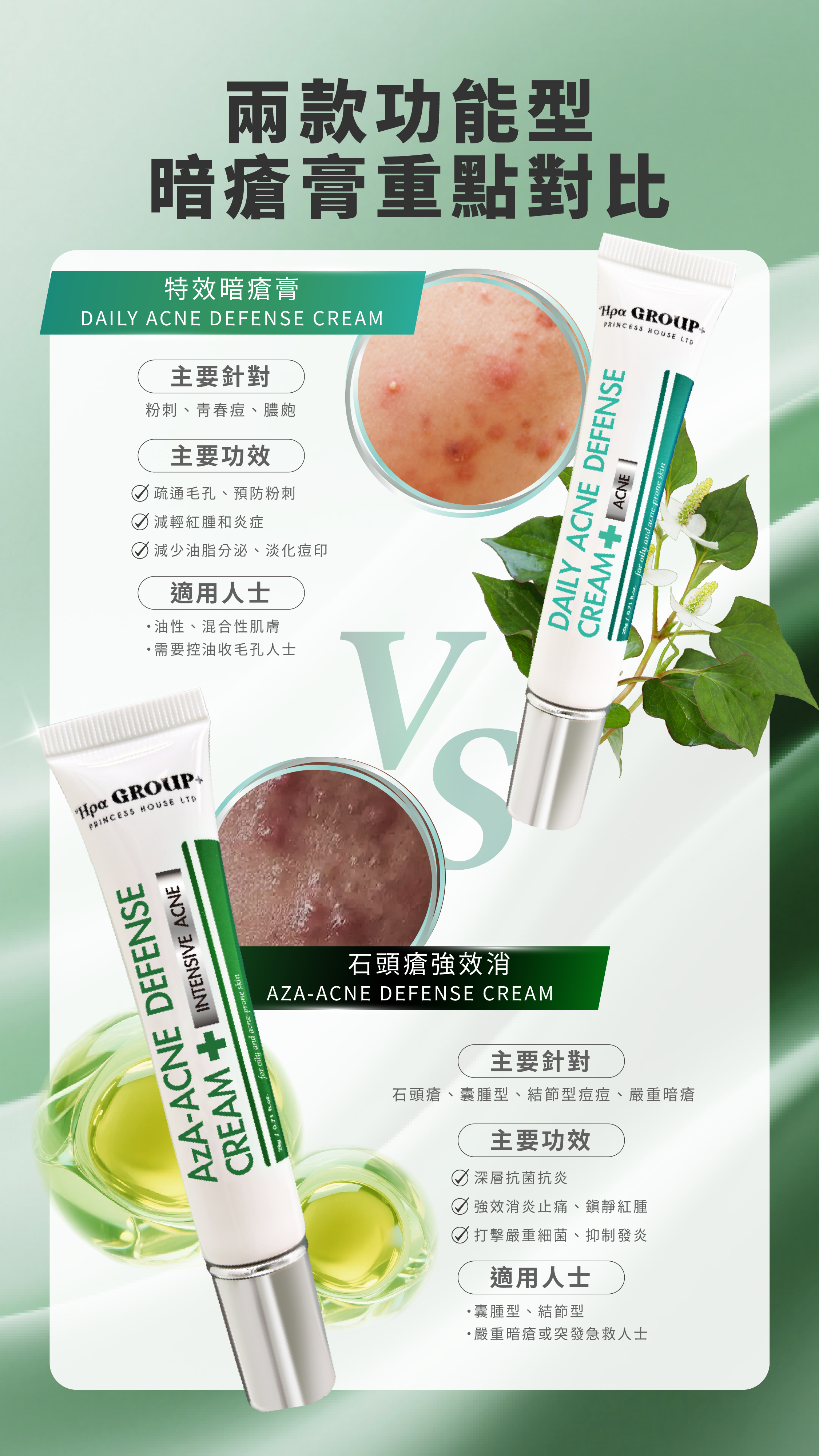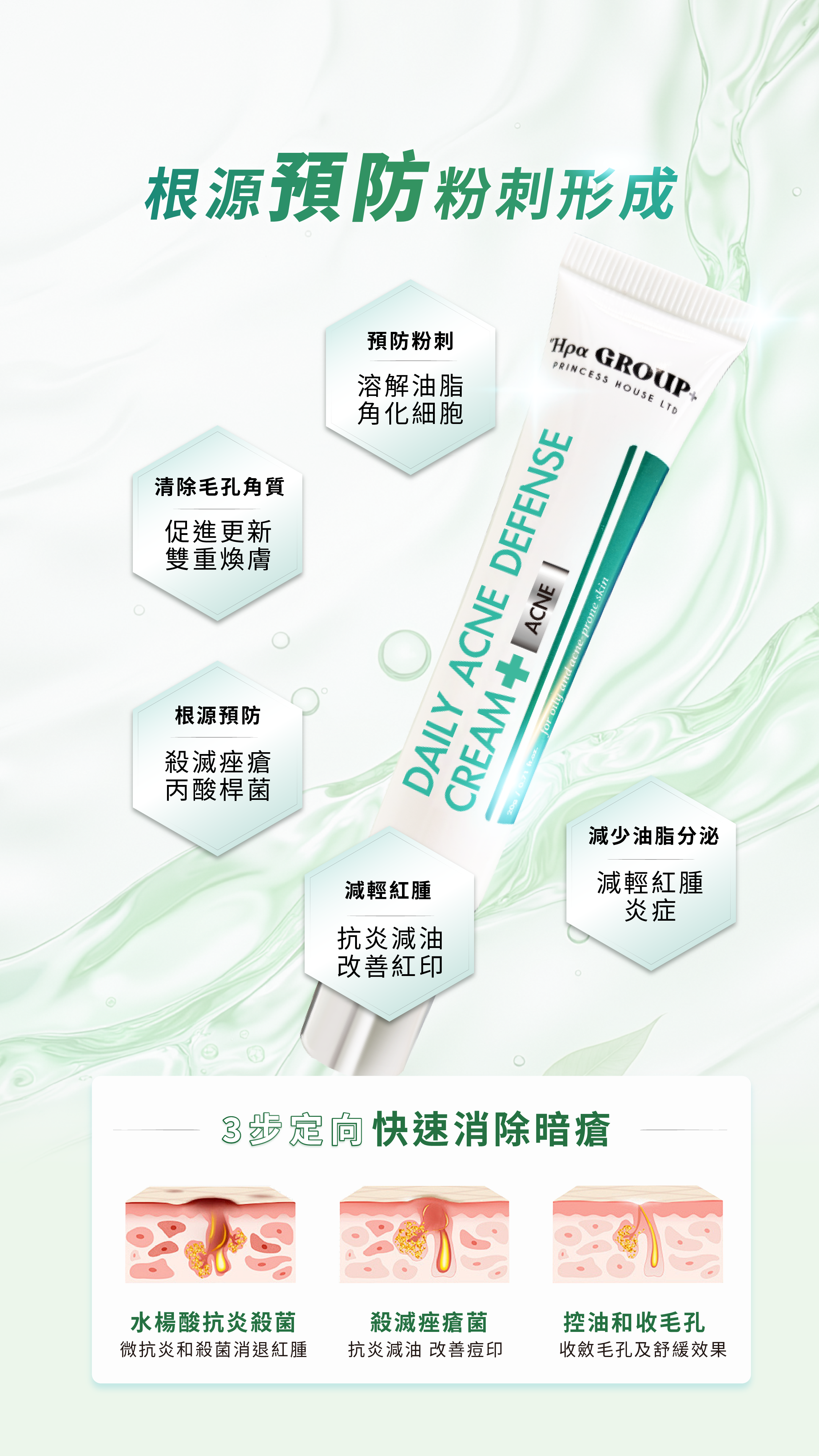 多重植物抗炎複合物: 包括北美金縷梅、榆繡線菊、黃芩、魚腥草、印度楝等提取物,共同協作舒緩痘痘的紅腫不適,提供抗氧化保護。