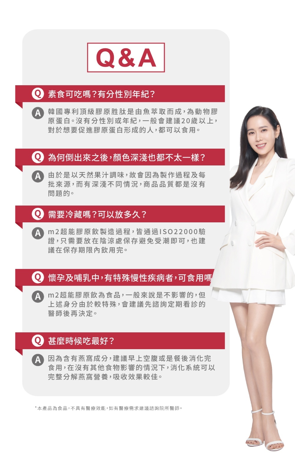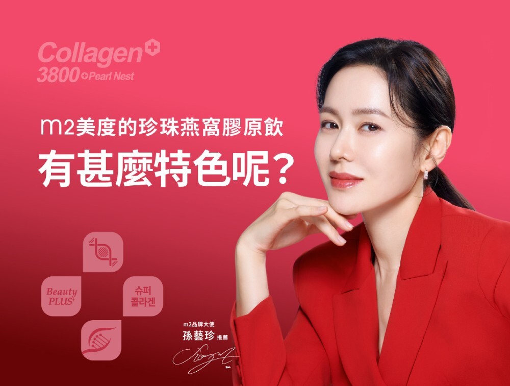 • ✵ 「m2美度」與韓國最大膠原製造廠合作,使用兩種胜肽等級的膠原,以特殊配比混合出品牌自家獨有的「濃密型雙胜膠原」, 認明「m2美度」品牌才是韓國正宗的膠原蛋白,是900DA道爾頓單位,也是品牌認為最適合肌膚吸收的大小分自結構。也是孫藝珍出道以來,認證有感的唯一代言,陪伴孫藝珍度過她最重要的人生歷程,也是她的最佳美麗後援。