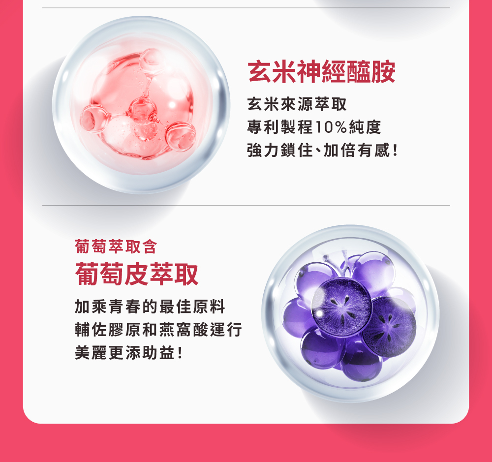 ✵ 添加專利金絲燕窩、奈米珍珠粉、玄米萃取神經醯胺、葡萄籽萃取、維生素C,青春滋養。